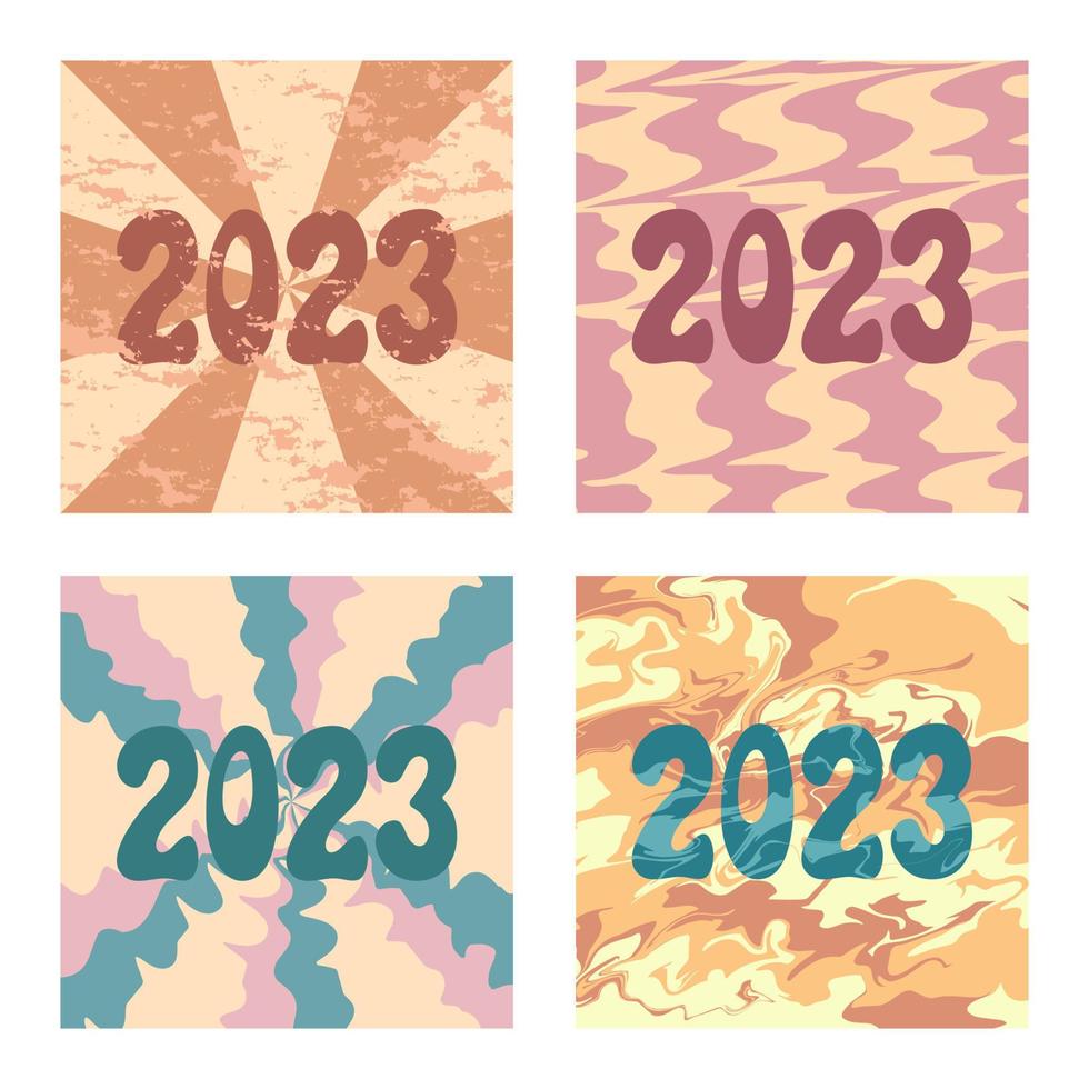 2023 numbers on abstract trippy backgrounds. Vector set of square trendy illustrations. Groovy, retro and psychedelic design. Social media 2023 post templates collection Pro Vector