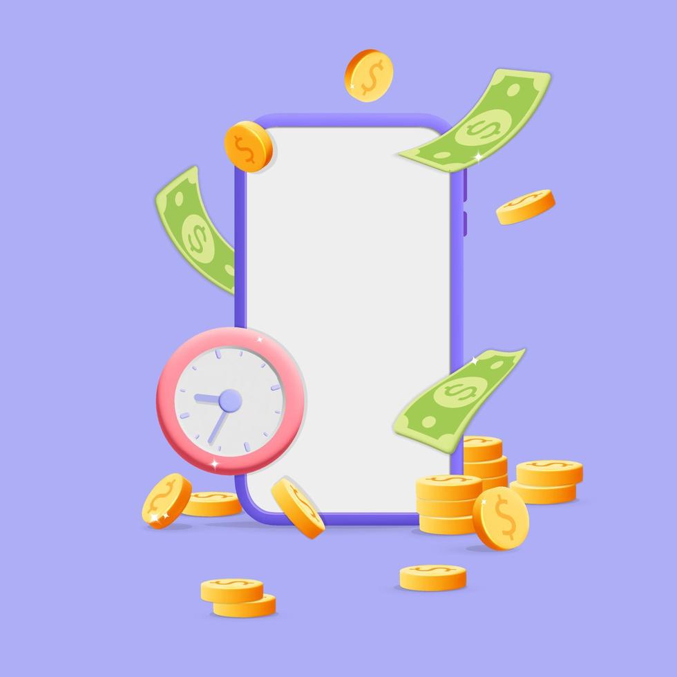 3d vector mobile phone with alarm clock and floating money poster front view mockup design Pro Vector