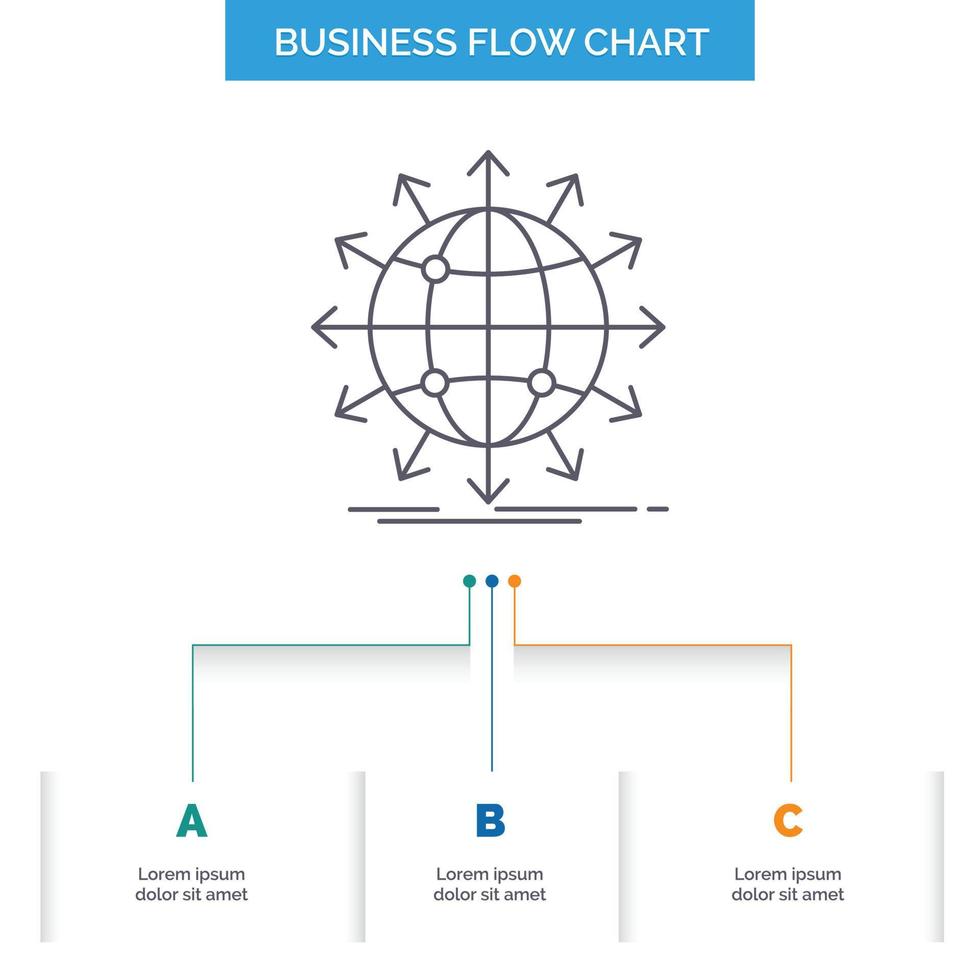 globe. network. arrow. news. worldwide Business Flow Chart Design with 3 Steps. Line Icon For Presentation Background Template Place for text Free Vector