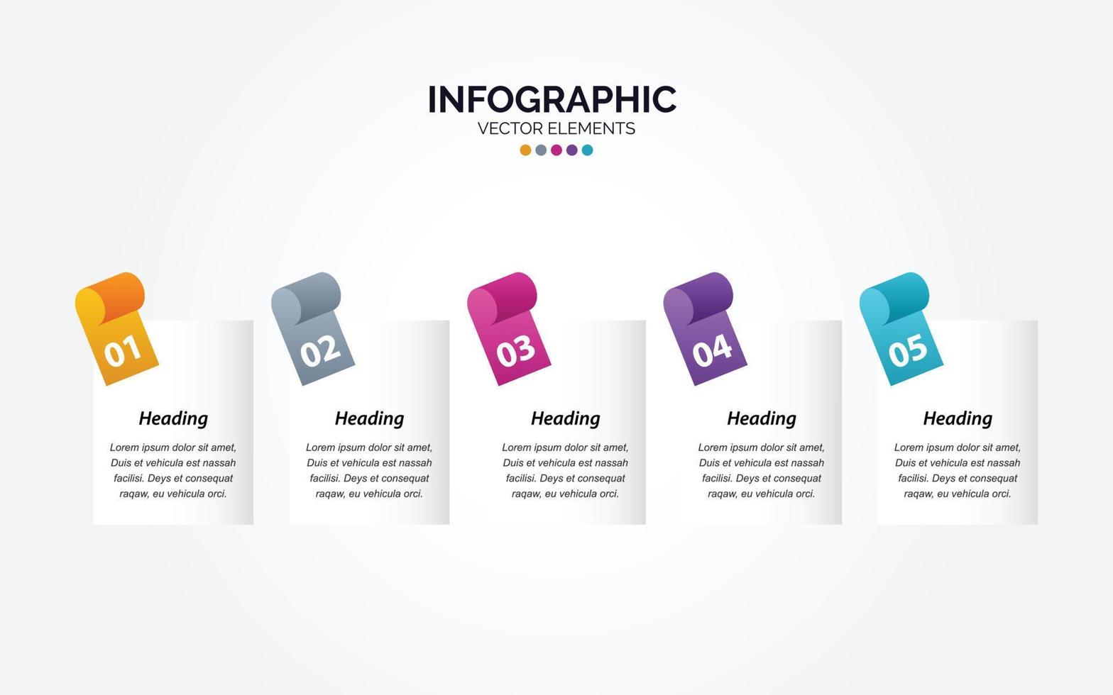 Five paper white overlapping arrows placed in horizontal row. Concept of 5 successive steps of progressive business development vector