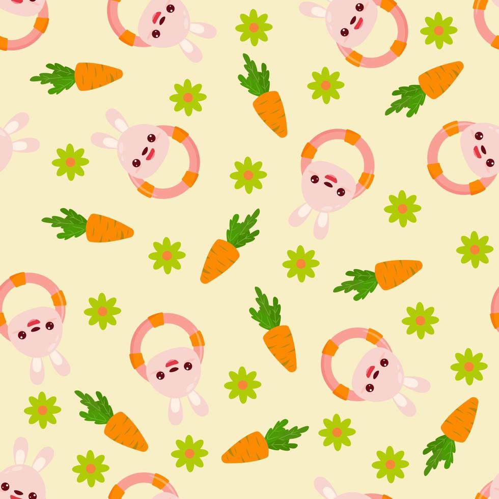 Seamless pattern with animals on a yellow background. A pattern with a baby rattle in the form of a rabbit. Kawaii animals Pro Vector