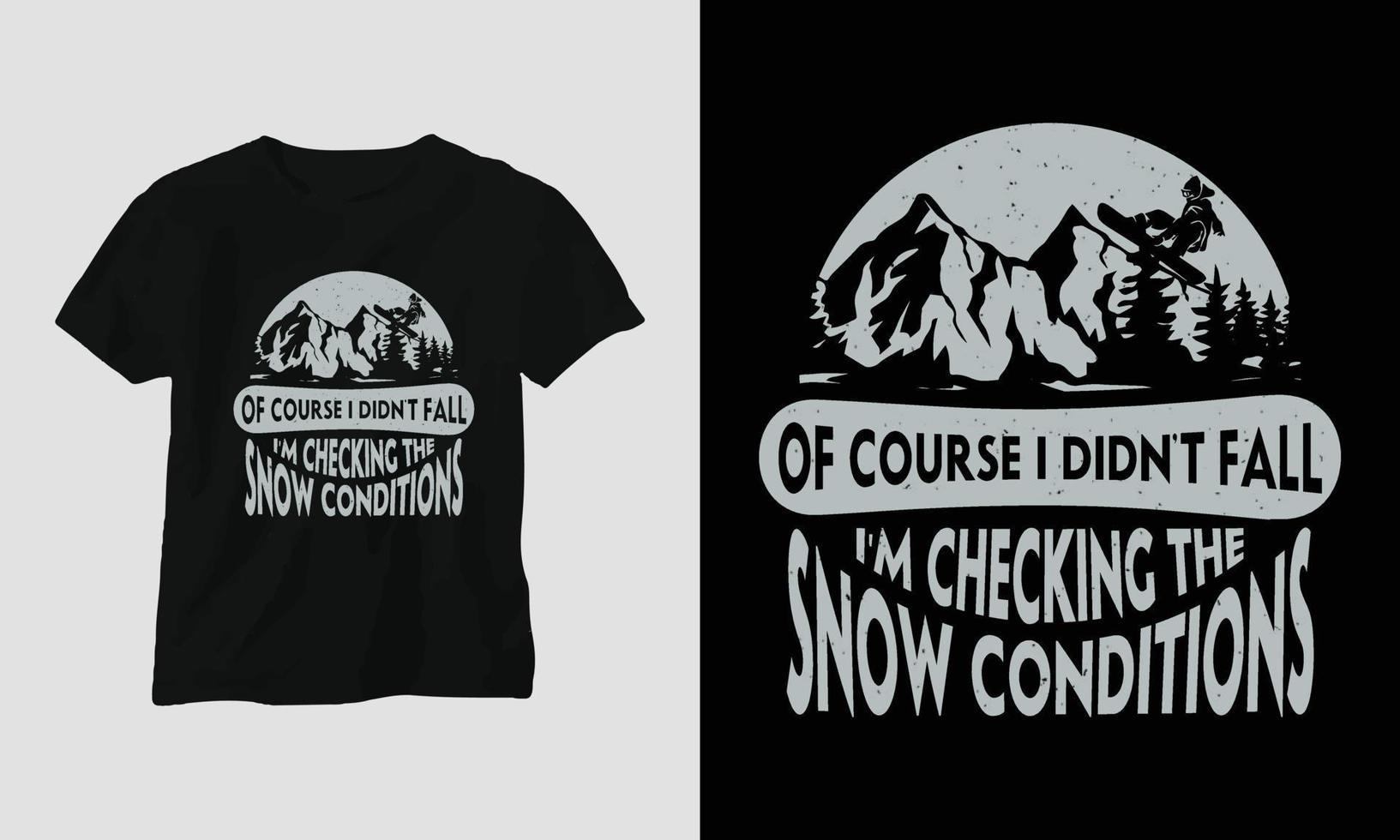 Of course i didn't fall i'm checking the snow conditions T-shirt Design with mountains, snowboard and retro style Pro Vector