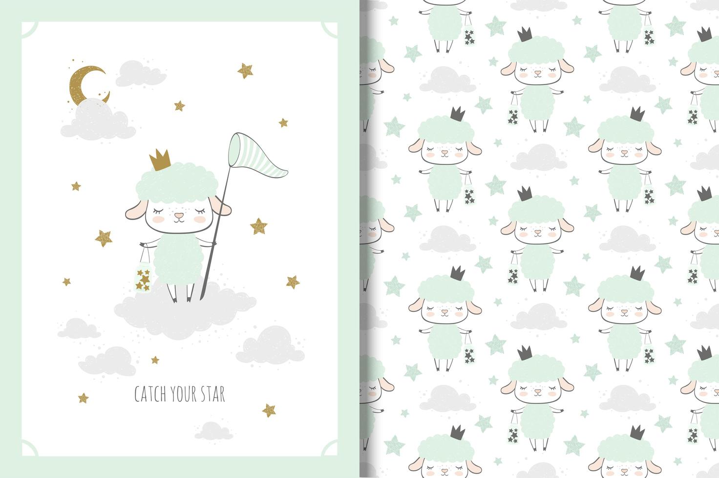Sheep princess with butterfly net drawing and pattern Pro Vector