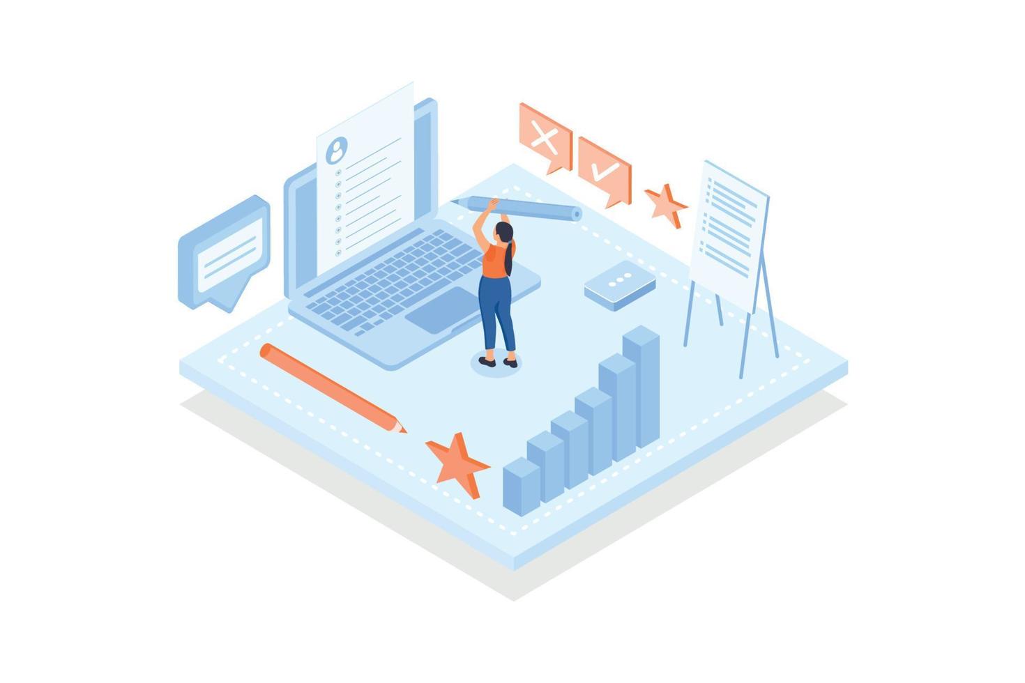 Conceptual template with woman filling in questionnaire on laptop computer screen. Scene for internet service for creation of public survey, statistical research, isometric vector modern illustration Pro Vector