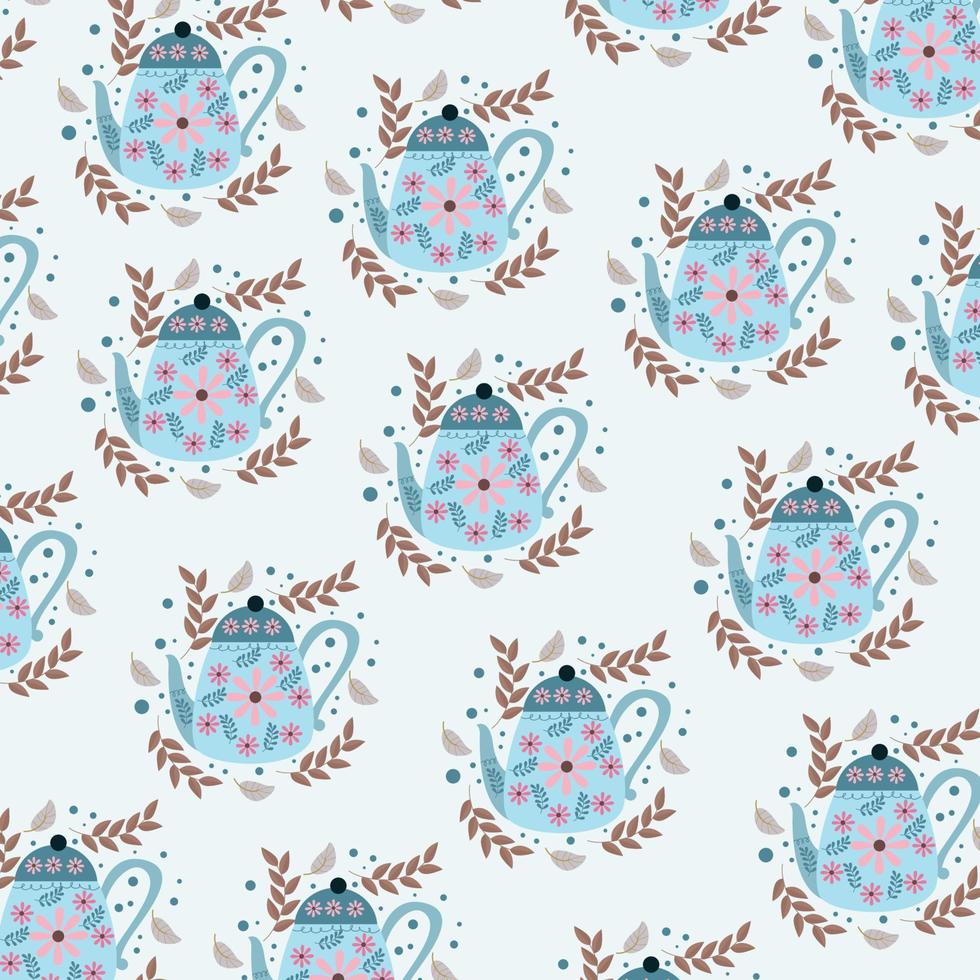 Classic pattern with hand drawn teapot and leaf pattern surrounding it. Vector illustration Pro Vector