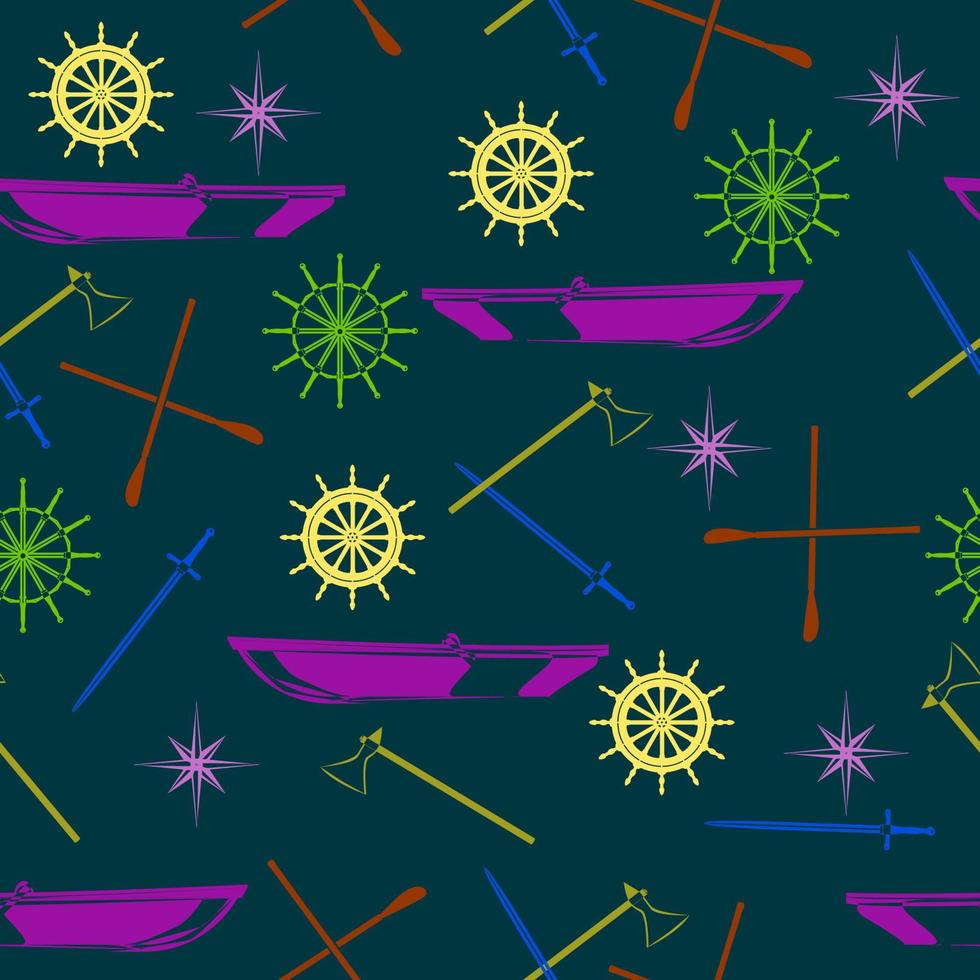 Boat, oars, steerling wheel, axe and sword in outline style. Seamless pattern. Sea texture. Printable design. Wallpaper element. Random square pattern. Pro Vector