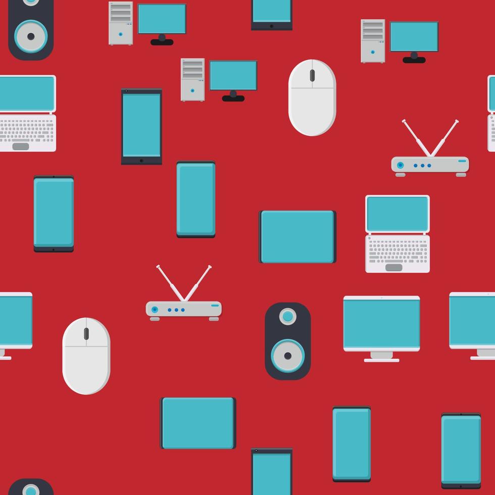 Seamless pattern, texture from modern digital devices, gadgets, tablets, smartphones, mice, speakers, monitors, laptops, routers for internet, computer equipment on a red background. Vector Pro Vector