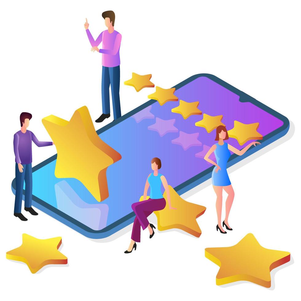 Isometric image of the customer service process.Assessment of the business activity rating.Formula feedback from customers.Evaluation of the app's performance by people, smartphone and stars rating. Pro Vector
