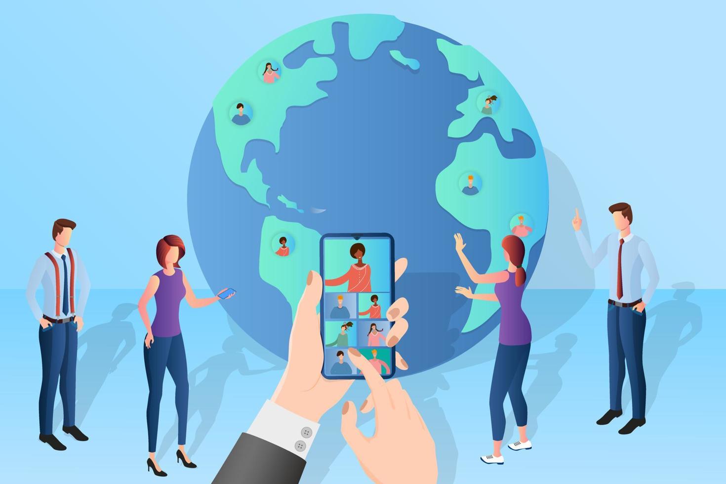 A group of businessmen hold an online video conference using a smartphone.Hands of a person with a smartphone on the background of the planet Earth.modern technologies of remote work and freelancing. Pro Vector