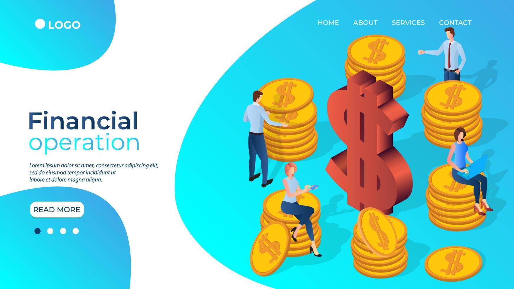People are engaged in financial transactions.People on the background of coins and a large dollar sign.Teamwork financial control and monitoring.3D-image.The template of the landing page. Pro Vector