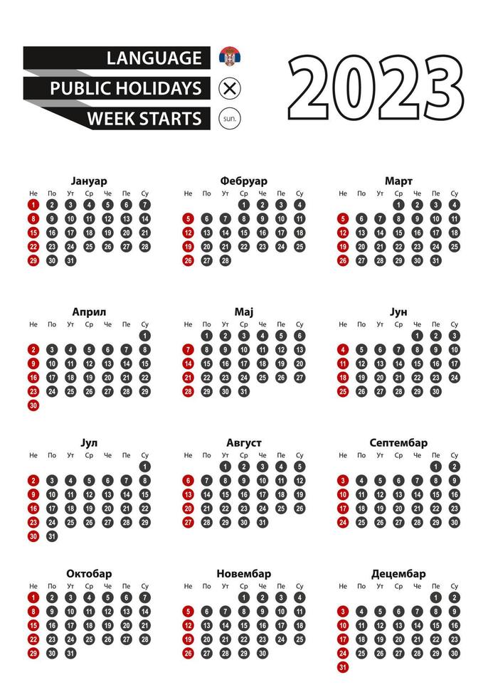 Serbian calendar 2023 with numbers in circles, week starts on Sunday. 2023 with flag of Serbia. Pro Vector