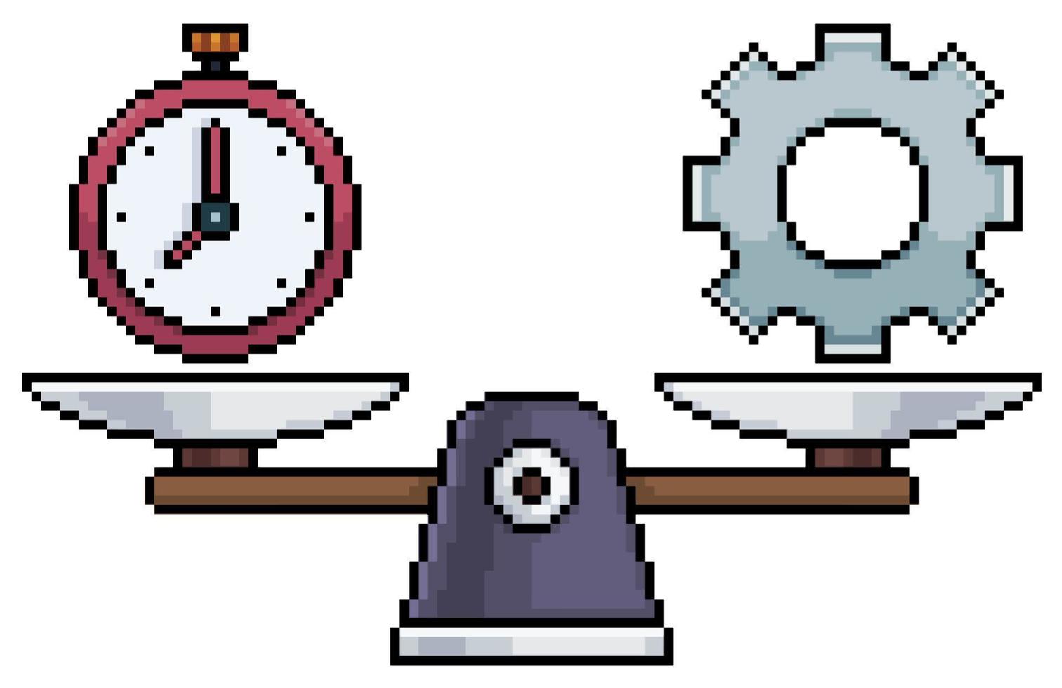 Pixel art scales with clock and gear vector icon for 8bit game on white background Pro Vector