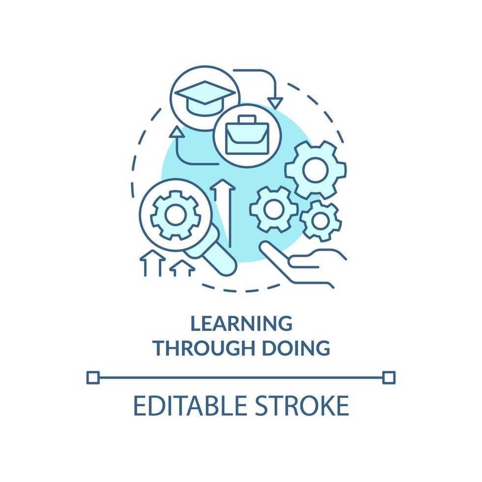 Learning through doing turquoise concept icon. Apply knowledge. Learning principle abstract idea thin line illustration. Isolated outline drawing. Editable stroke. Pro Vector