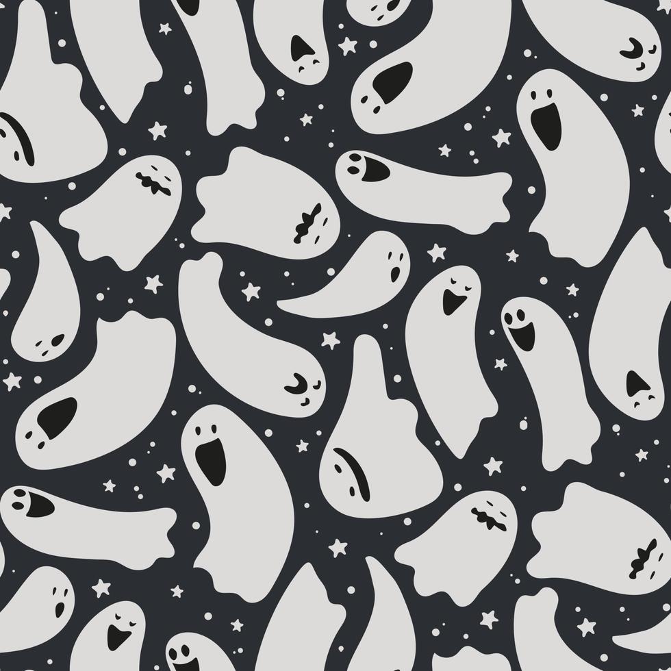 Background of ghosts in the sky with stars. Seamless pattern with flying ghosts. Suitable for printing on textiles and paper. Themed gift wrapping, notebook cover. Pro Vector