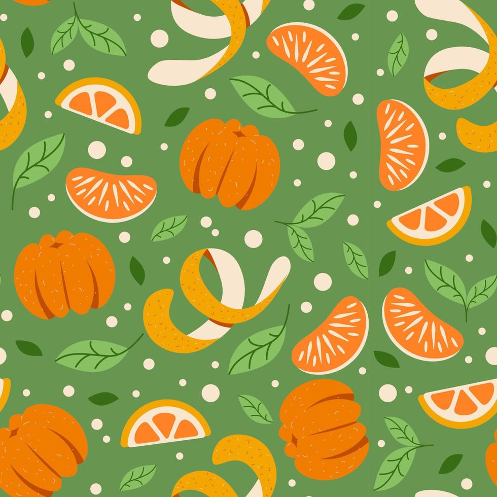 Seamless pattern with citrus fruits. Tangerines and oranges on a green background. Packaging paper, print, textile, fabric Pro Vector