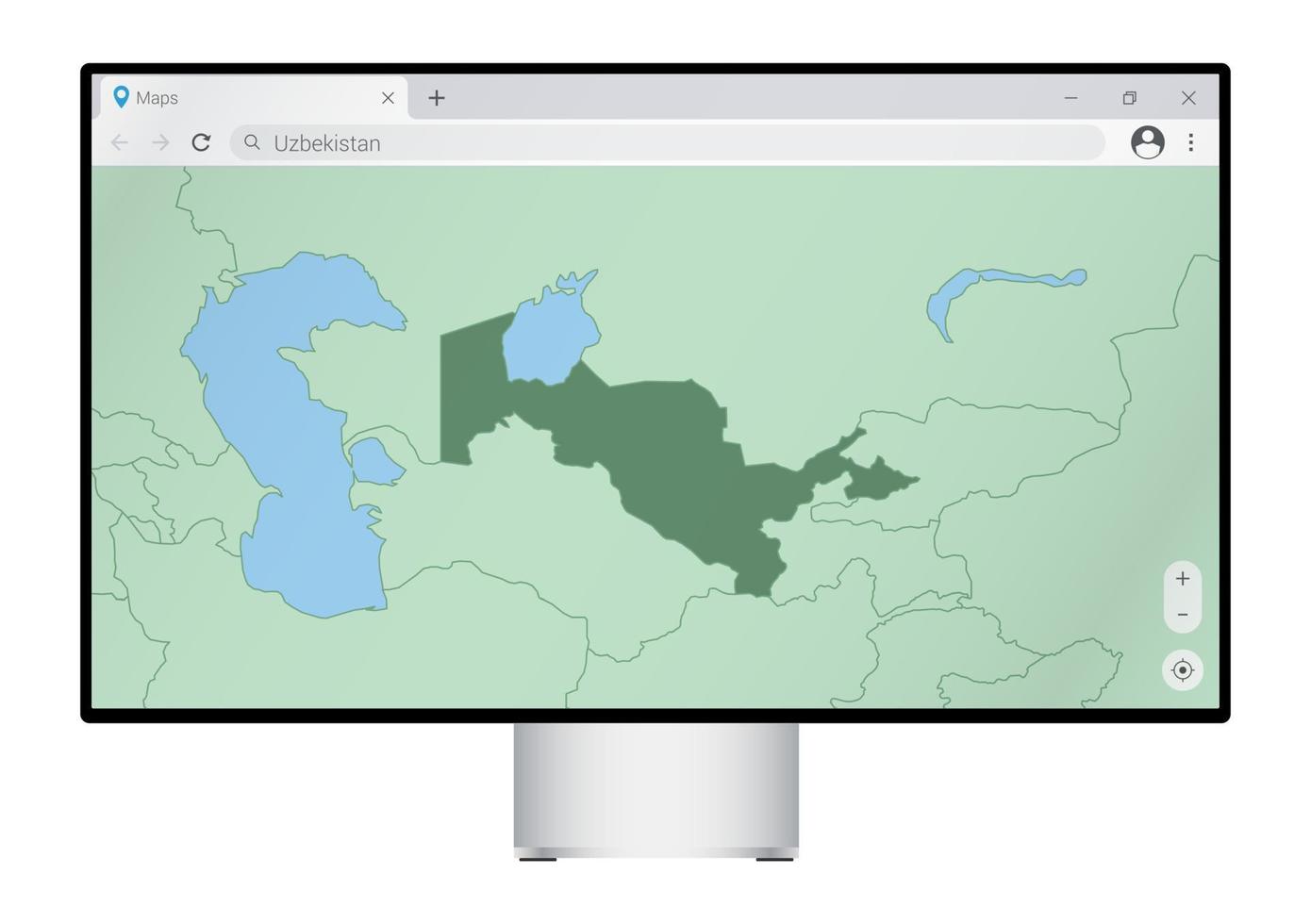 Computer monitor with map of Uzbekistan in browser, search for the country of Uzbekistan on the web mapping program. Pro Vector