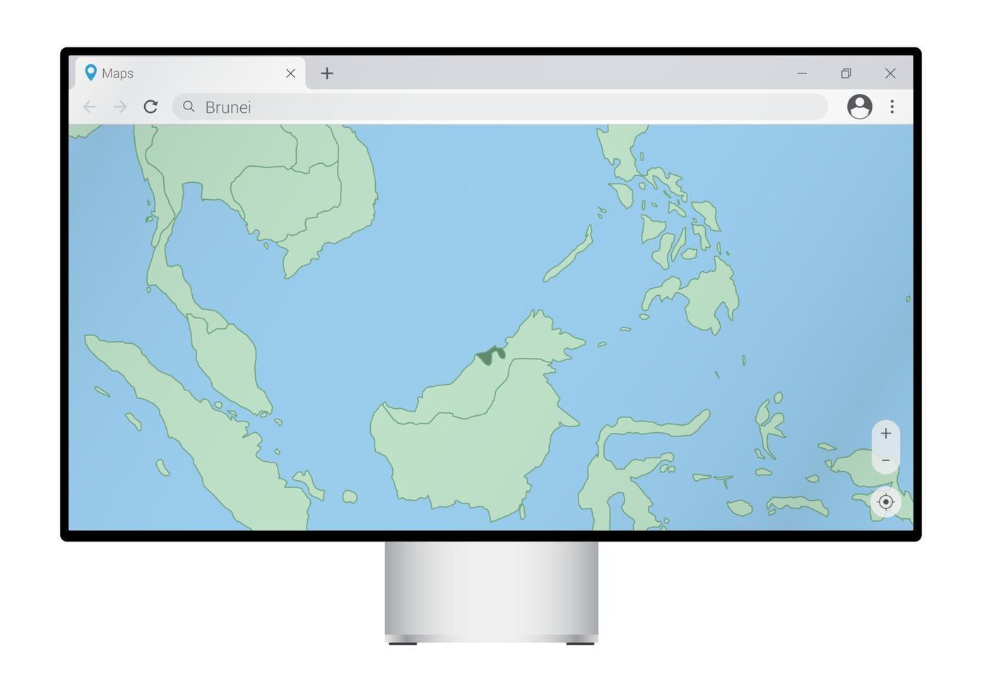 Computer monitor with map of Brunei in browser, search for the country of Brunei on the web mapping program. Pro Vector
