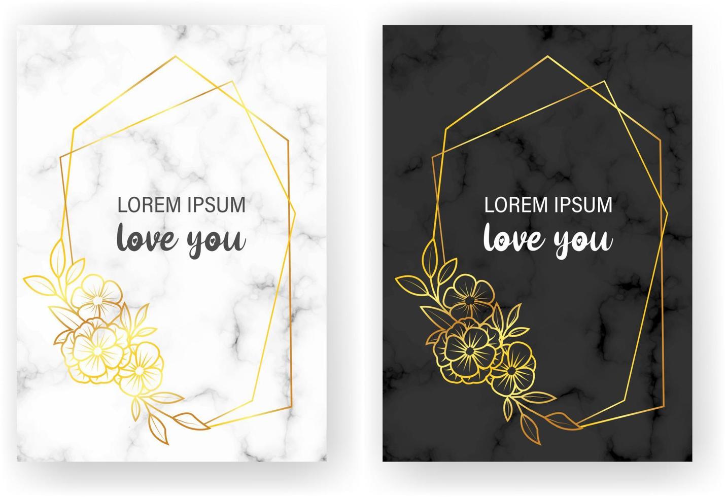Elegant wedding invitations set with golden geometric frames and gray marble texture. Luxury invitation collection with save the date, rsvp, menu, table number and name card vector templates Pro Vector