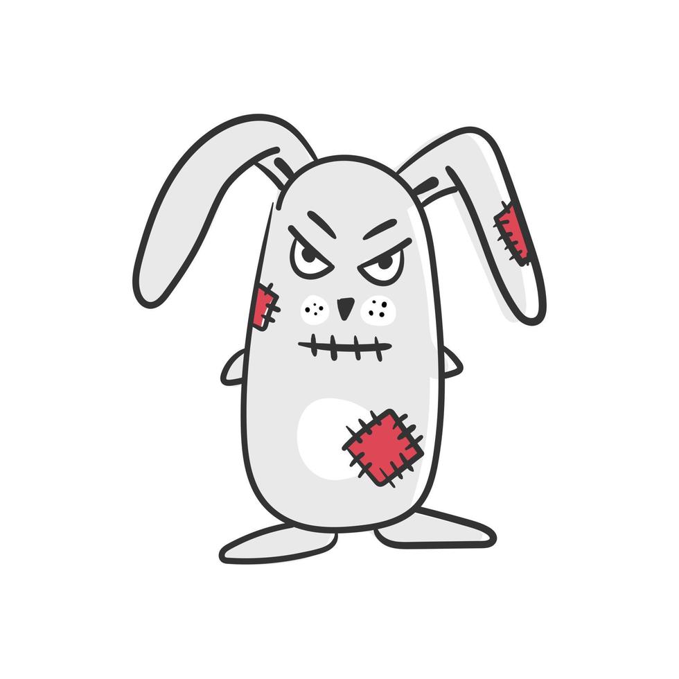 Angry bunny digital design for creating decor and printing on t-shirts, caps. Vector on white. Plush rabbit with sewn-in patches. Pro Vector