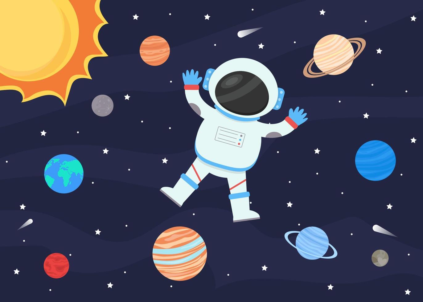 Astronaut in a spacesuit, against the background of the starry sky and the planets of the solar system. Pro Vector