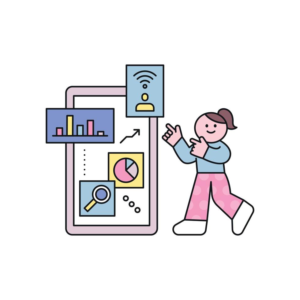 There are many analytics graphs on the mobile and a girl is pointing to the data. outline simple vector illustration. Pro Vector