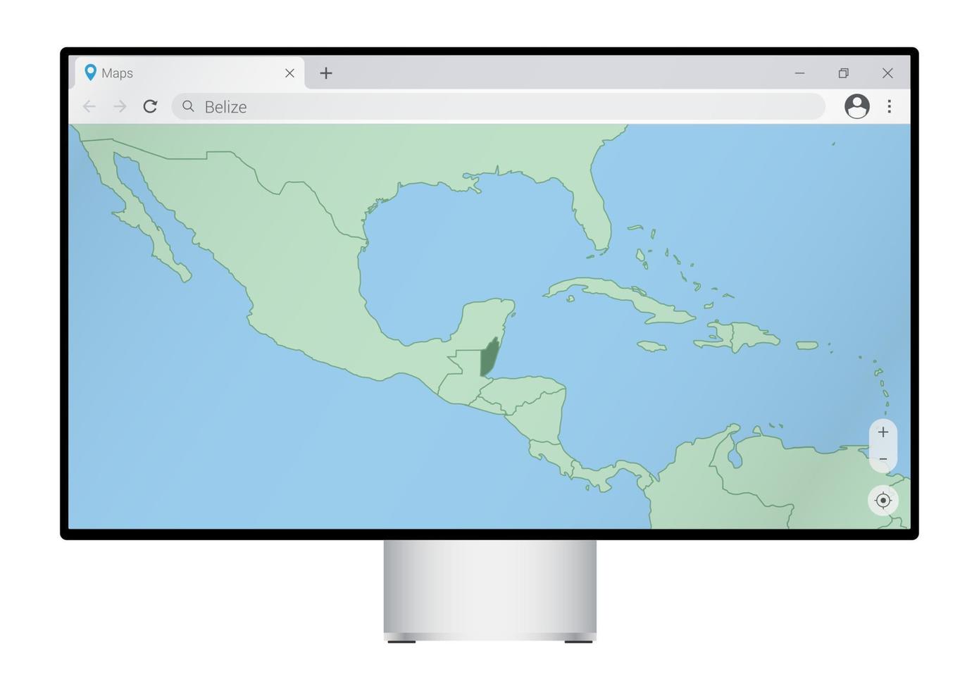 Computer monitor with map of Belize in browser, search for the country of Belize on the web mapping program. Pro Vector