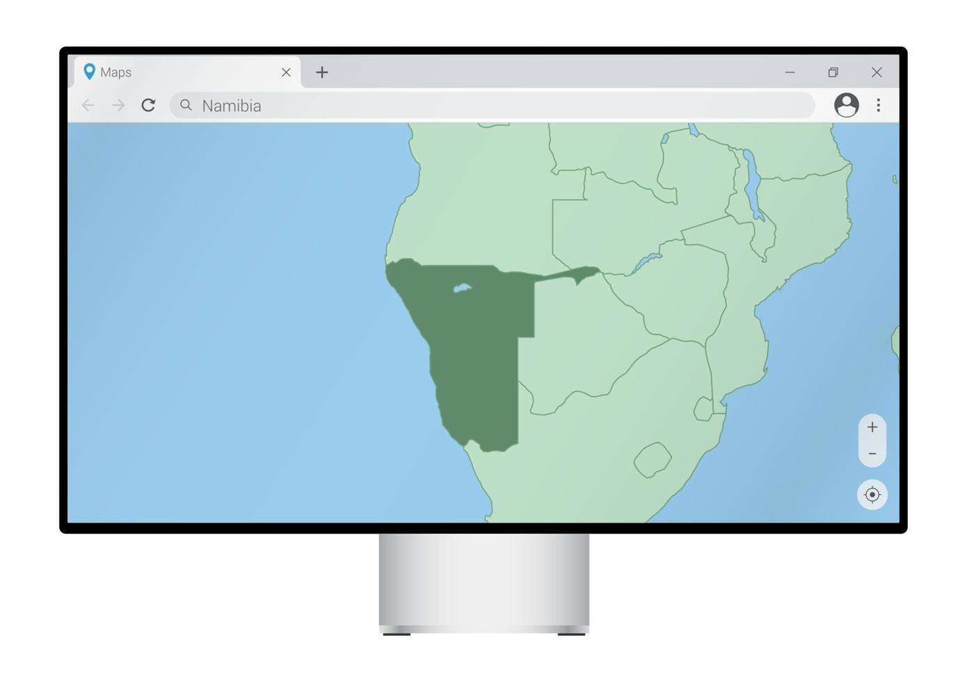 Computer monitor with map of Namibia in browser, search for the country of Namibia on the web mapping program. Pro Vector