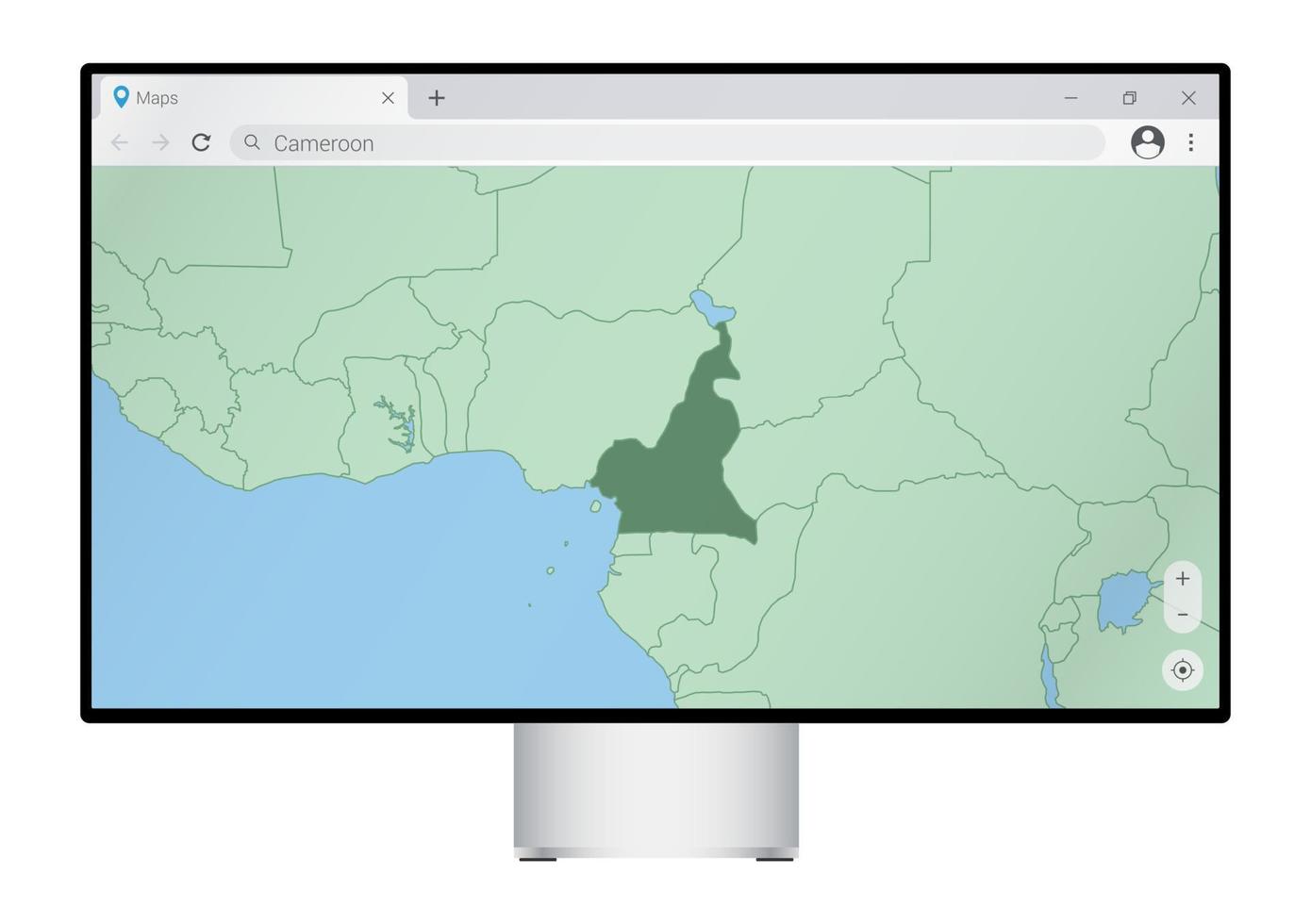 Computer monitor with map of Cameroon in browser, search for the country of Cameroon on the web mapping program. Pro Vector
