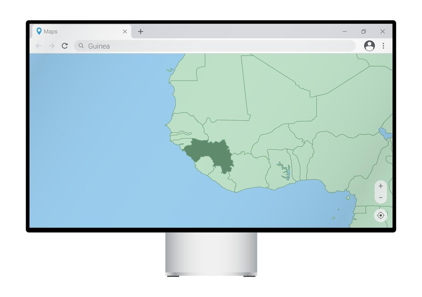 Computer monitor with map of Guinea in browser, search for the country of Guinea on the web mapping program. Pro Vector