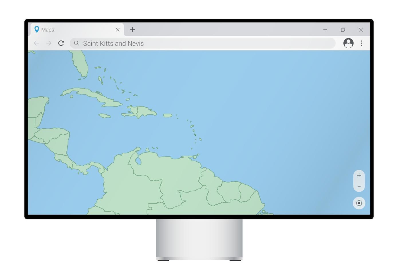 Computer monitor with map of Saint Kitts and Nevis in browser, search for the country of Saint Kitts and Nevis on the web mapping program. Pro Vector