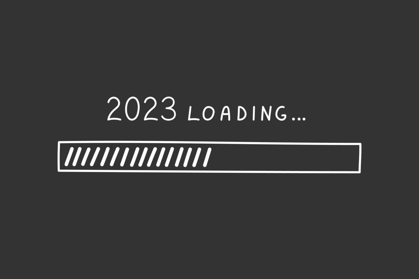 Progress bar 2023 new year in doodle style, vector illustration. Hand drawn loading symbol, white isolated element on chalk board background. Sketch load bar for print and design Pro Vector