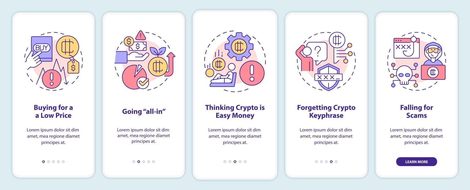 Common crypto mistakes onboarding mobile app screen. Beginner fails walkthrough 5 steps editable graphic instructions with linear concepts. UI, UX, GUI template. Pro Vector