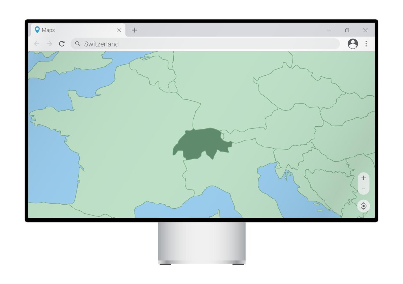 Computer monitor with map of Switzerland in browser, search for the country of Switzerland on the web mapping program. Pro Vector