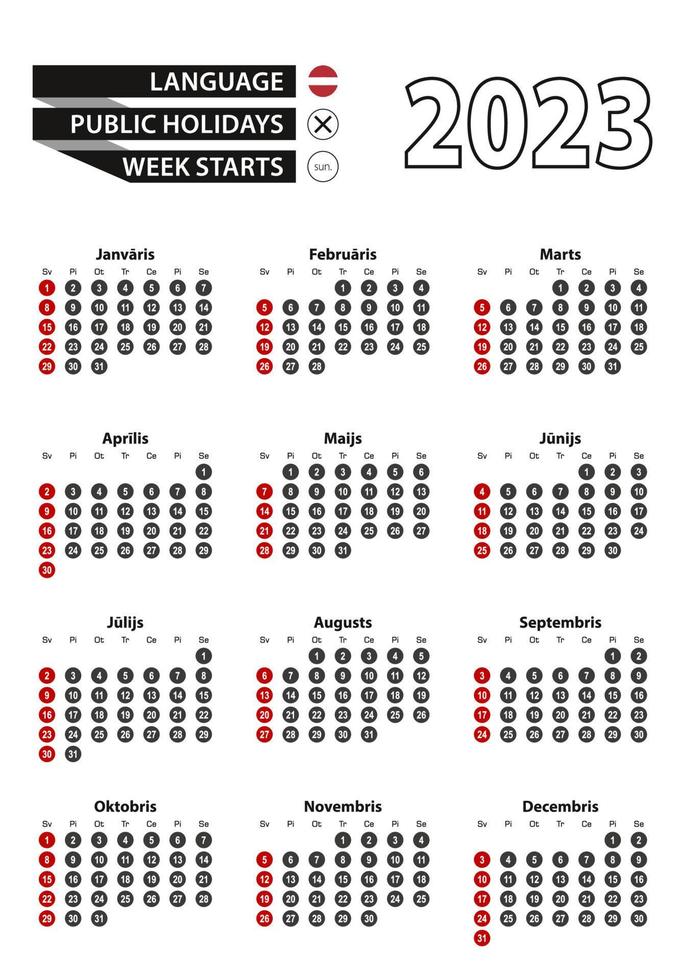 Latvian calendar 2023 with numbers in circles, week starts on Sunday. 2023 with flag of Latvia Pro Vector