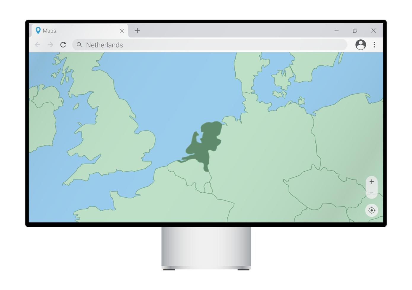 Computer monitor with map of Netherlands in browser, search for the country of Netherlands on the web mapping program. Pro Vector
