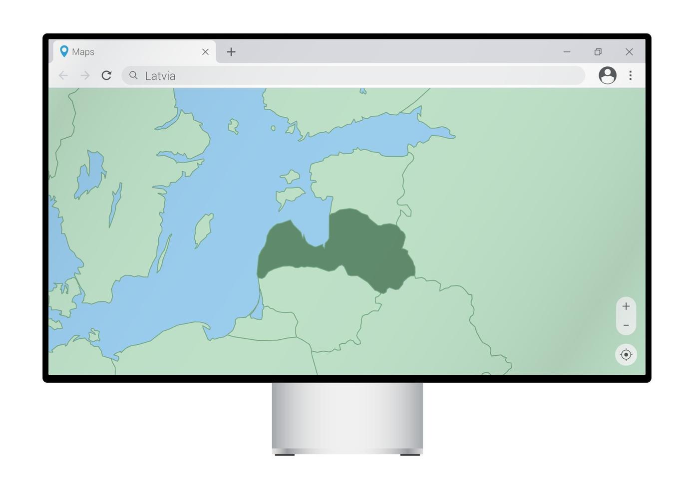 Computer monitor with map of Latvia in browser, search for the country of Latvia on the web mapping program. Pro Vector