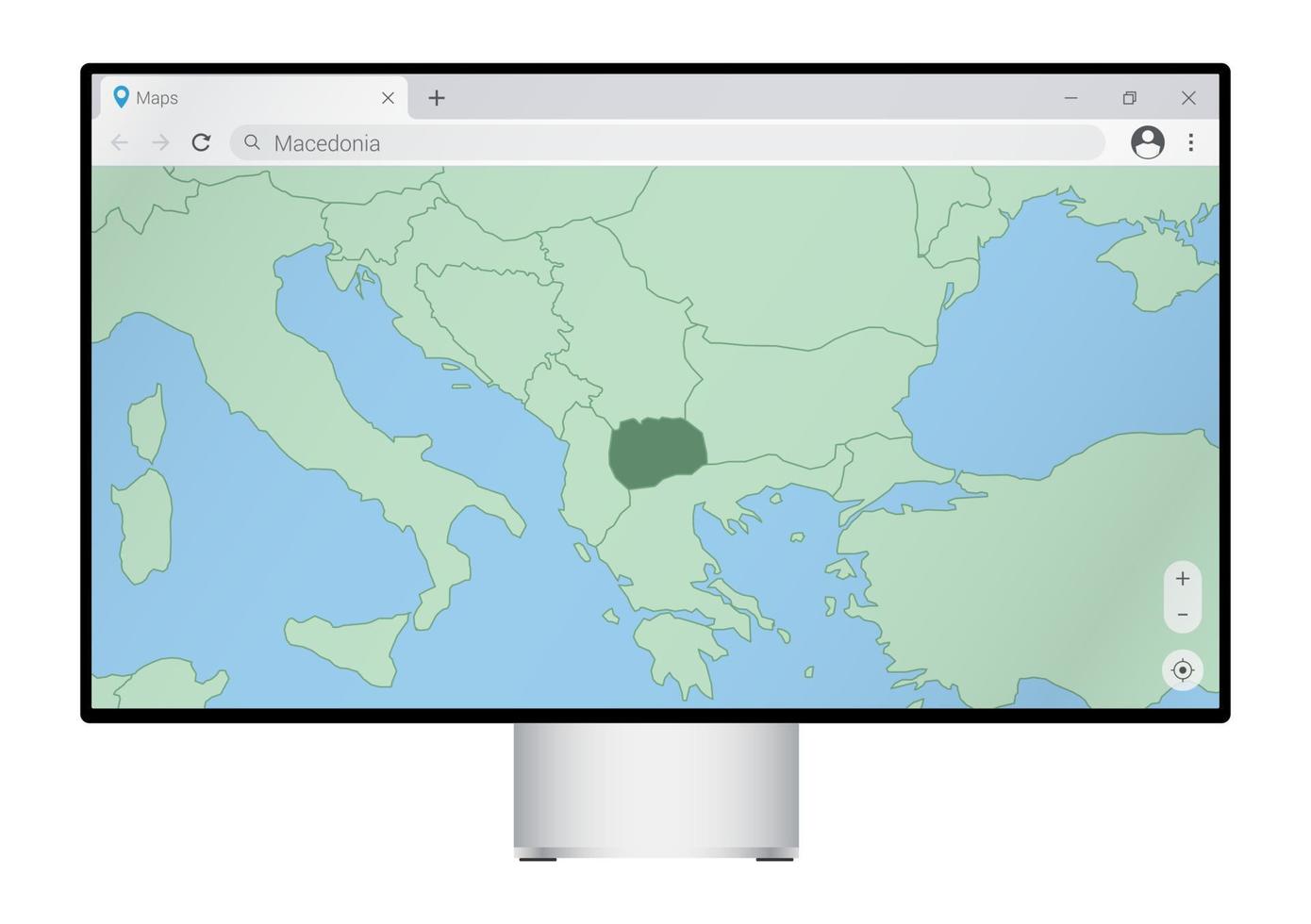 Computer monitor with map of Macedonia in browser, search for the country of Macedonia on the web mapping program. Pro Vector
