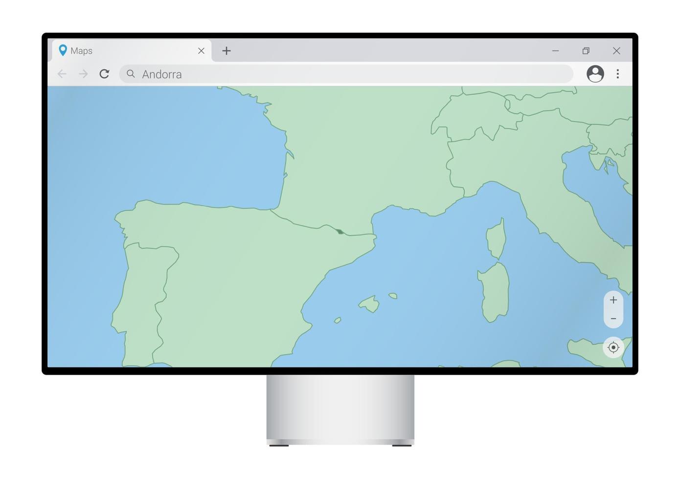 Computer monitor with map of Andorra in browser, search for the country of Andorra on the web mapping program. Pro Vector