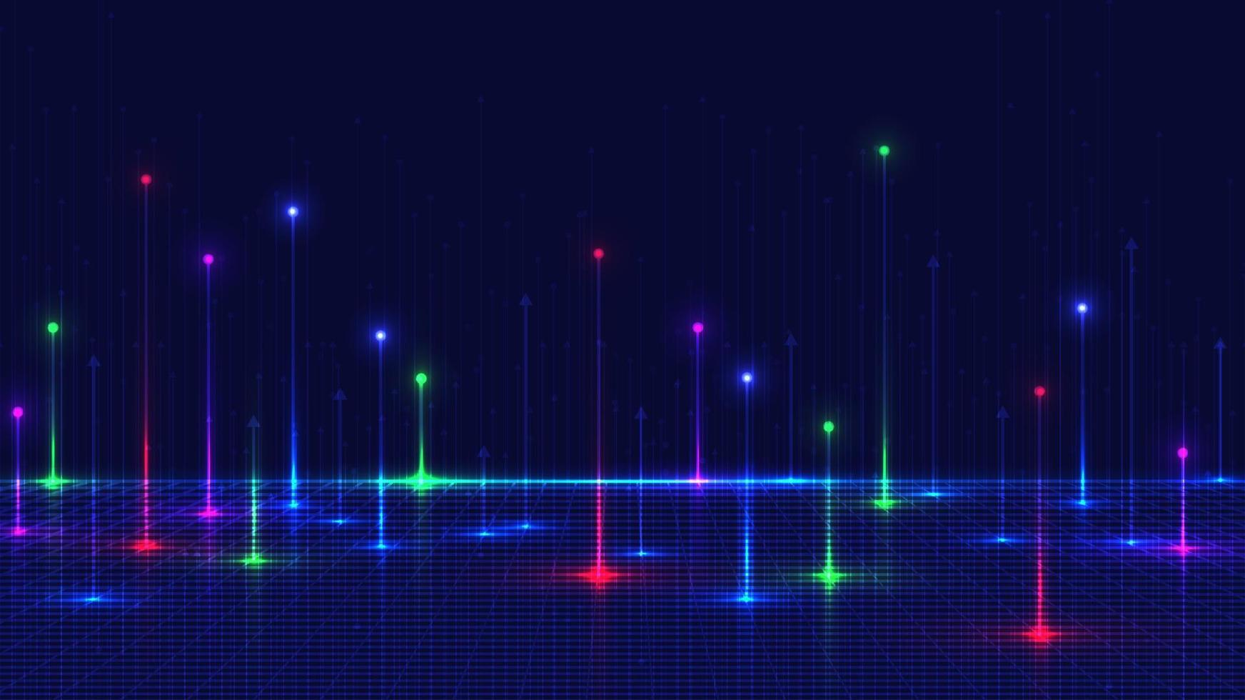 Abstract technology futuristic big data visualization concept neon lighting effect arrow lines signal pattern on dark blue lines grid perspective background Pro Vector
