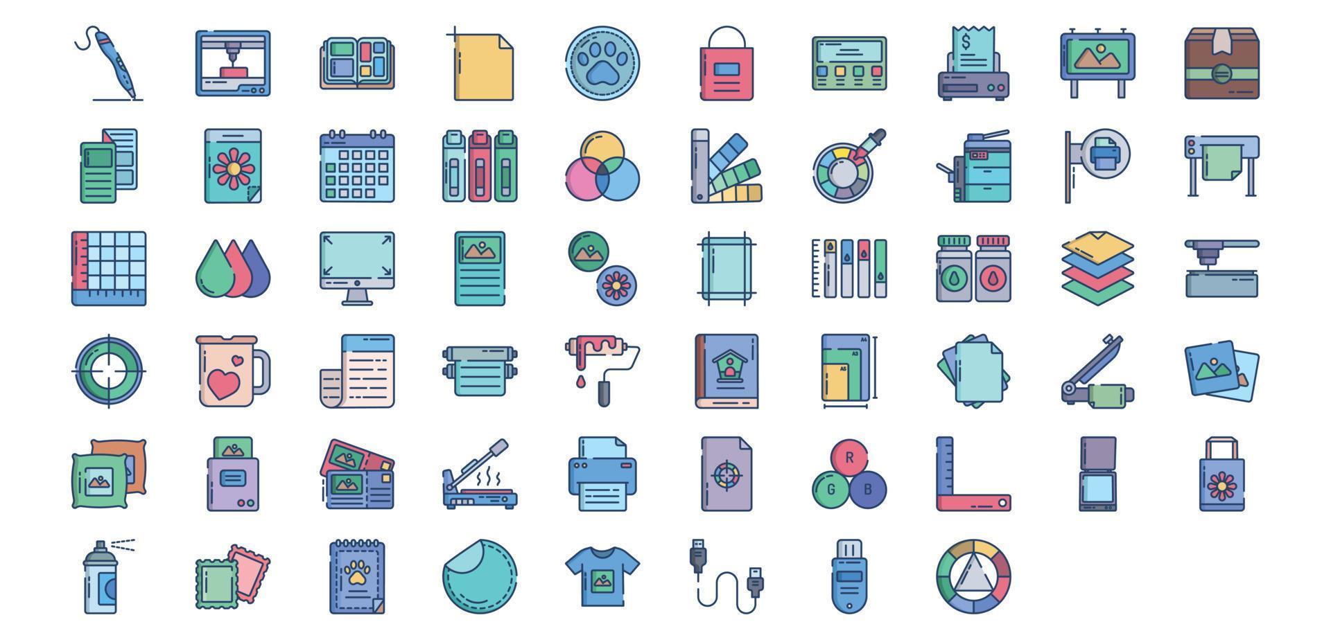 Collection of icons related to Printing and binding, including icons like Art board, 3d Printer, Badges, Banner and more. vector illustrations, Pixel Perfect set Pro Vector