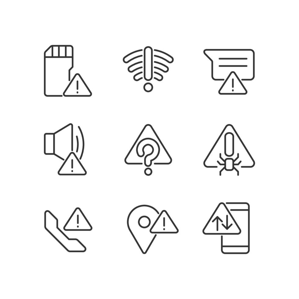Common electronic device issues pixel perfect linear icons set. Warning signal. Computer problem. Customizable thin line symbols. Isolated vector outline illustrations. Editable stroke Pro Vector