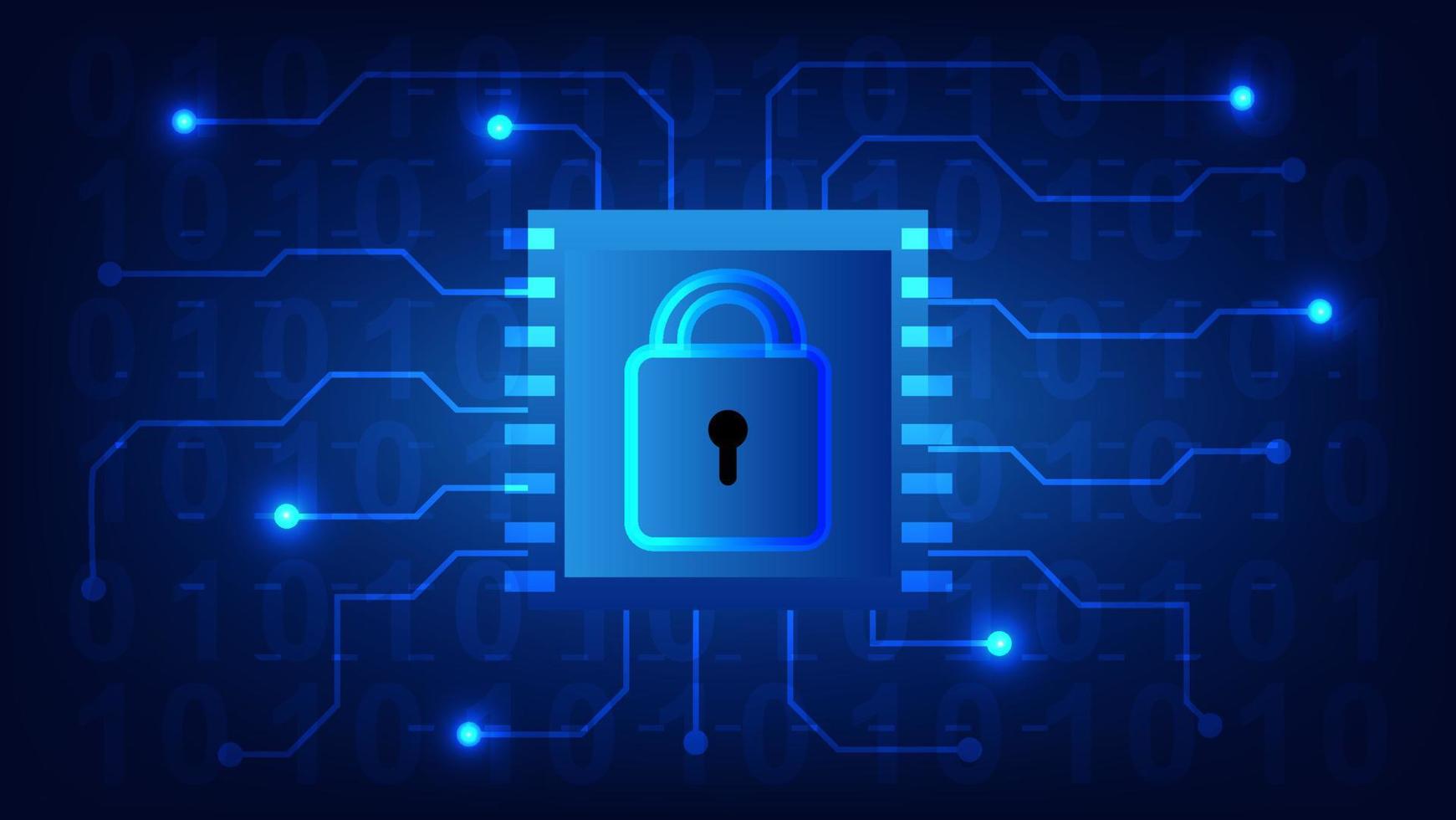 cyber security technology and privacy data protection concept. padlock on chip and circuit board on blue lighting background Pro Vector