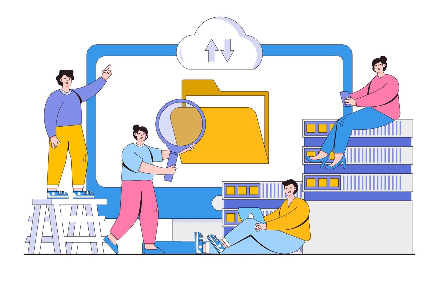 Flat big data streams processing with people characters concept. Outline design style minimal vector illustration for landing page, web banner, infographics, hero images. Pro Vector