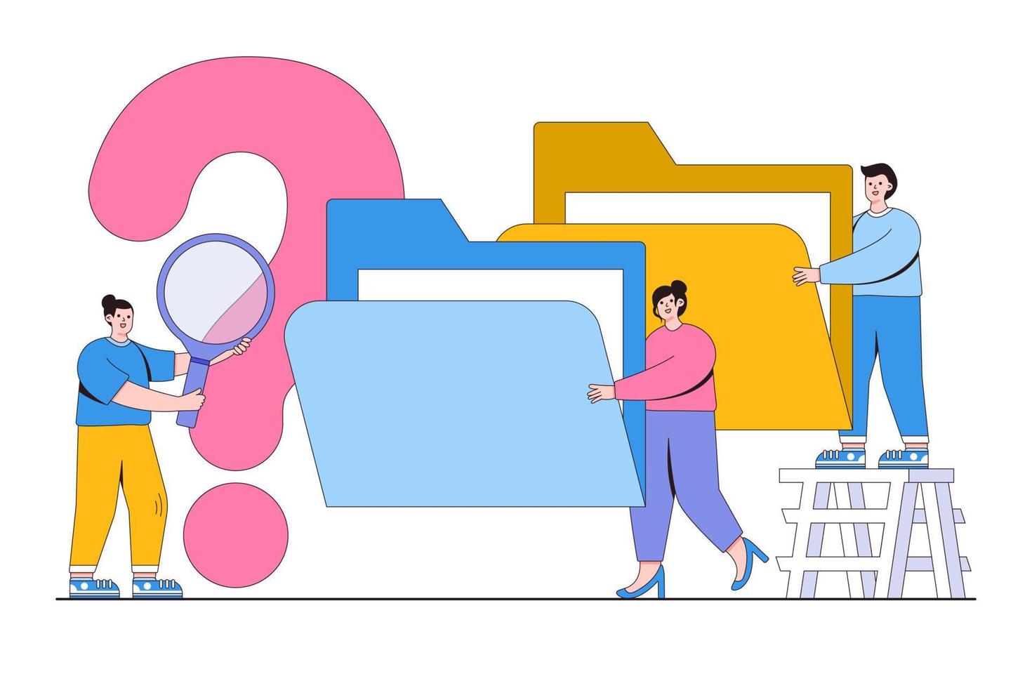 Flat characters of people searching through files concept. Outline design style minimal vector illustration for landing page, web banner, infographics, hero images. Pro Vector