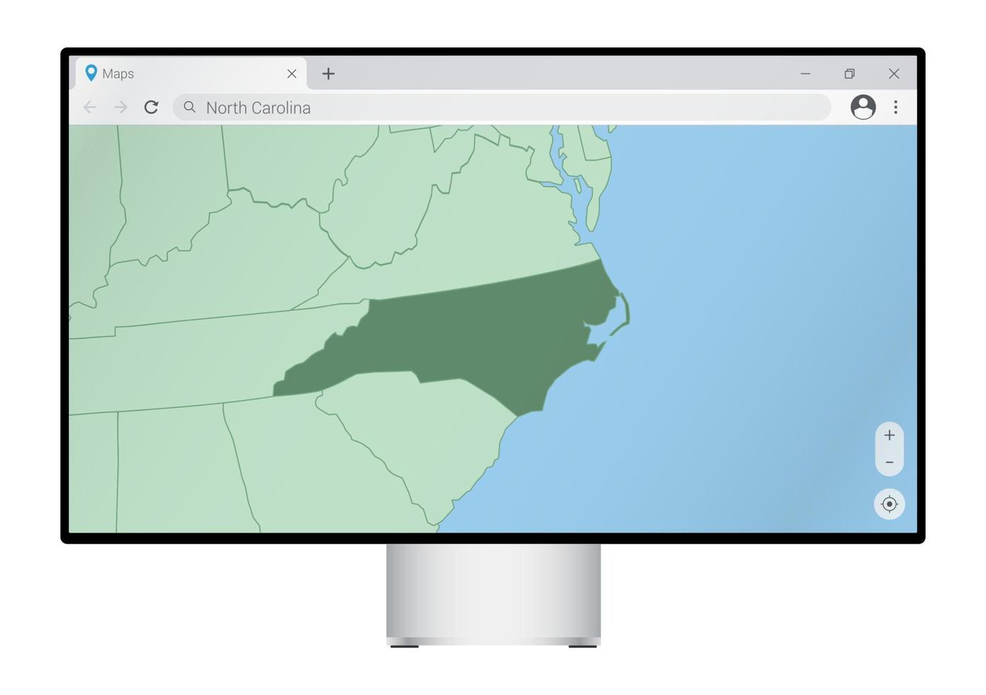 Computer monitor with map of North Carolina in browser, search for the country of North Carolina on the web mapping program. Pro Vector