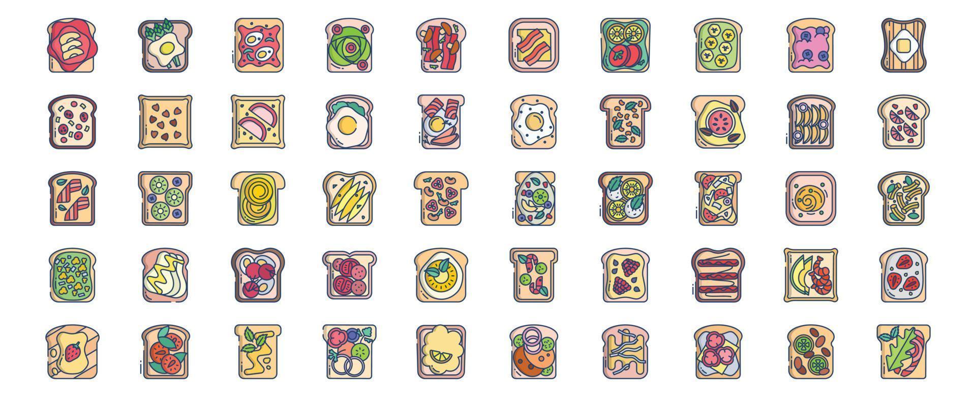 Collection of icons related to Toast topping, including icons like Bacon, Avocado, Butter, Mushroom, and more. vector illustrations, Pixel Perfect set Pro Vector