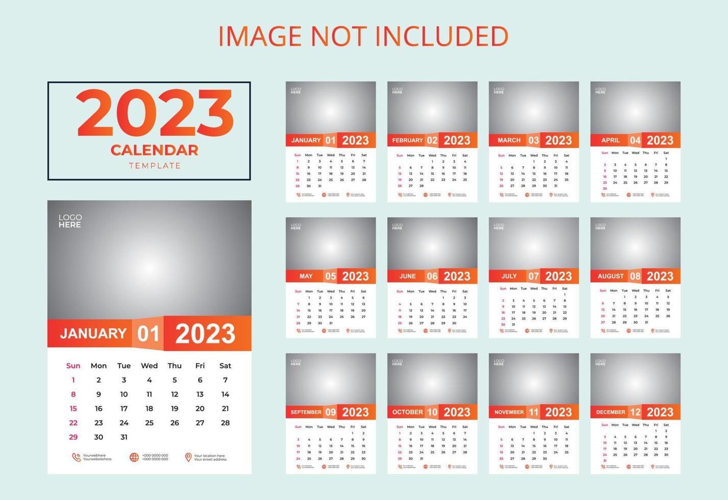 CALENDAR DESIGN 2023, 2023 WALL CALENDAR TEMPLATE, 12 PAGES CALENDAR DESIGN 2023, WALL CALENDAR DESIGN 2023 Free Vector and Free SVG