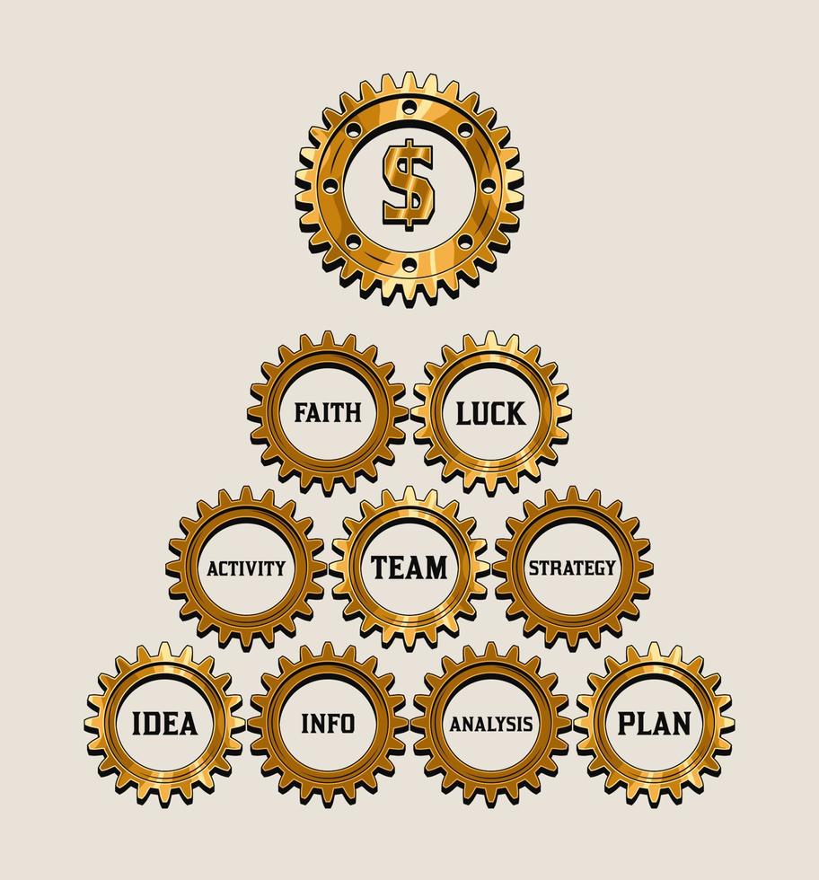 Business mechanism concept of success with gold, silver gearwheels composed in the shape of pyramid with dollar sign above. Key points of success - strategy, analytics, research, teamwork, etc. Pro Vector