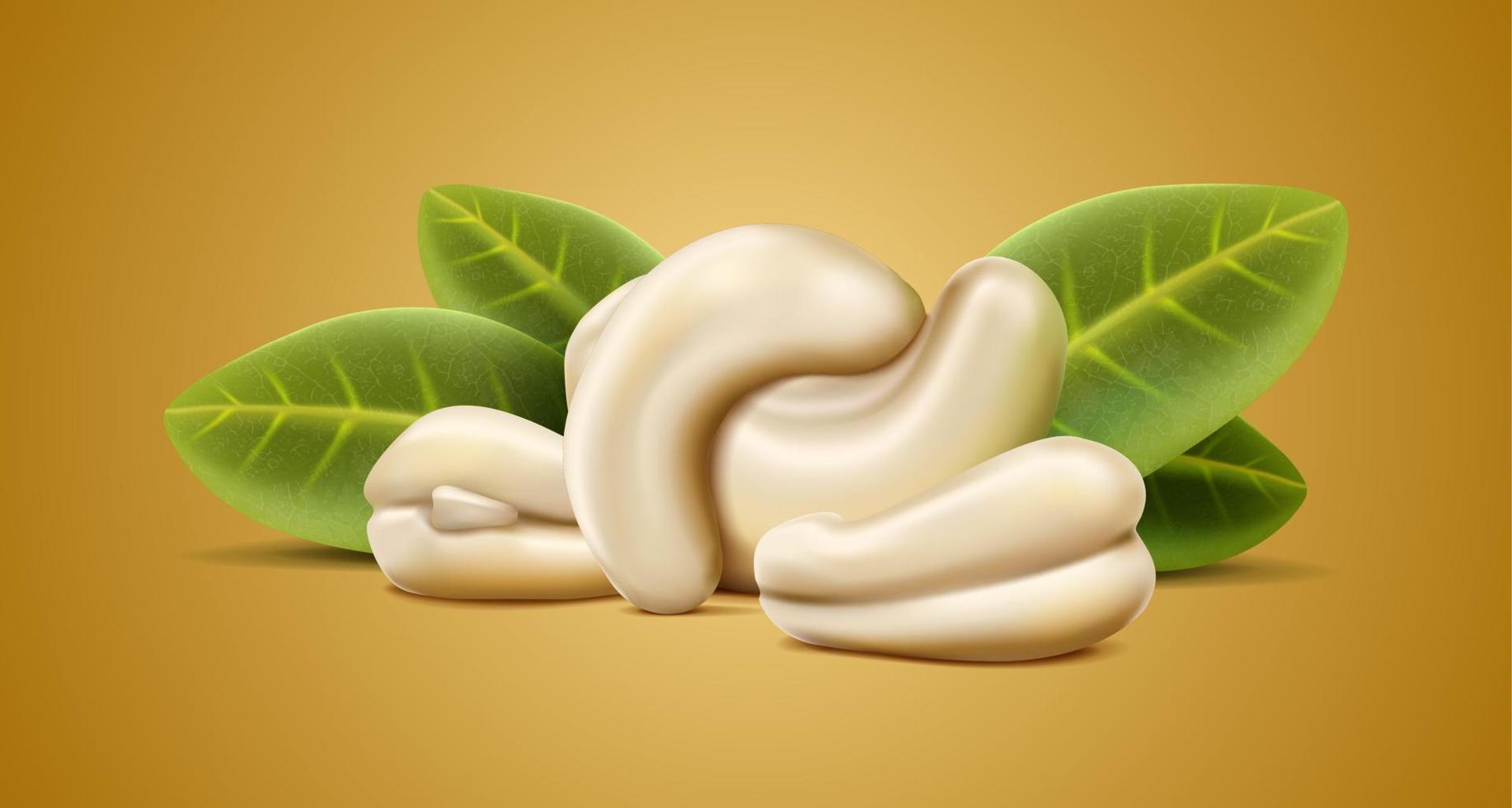 3d realistic vector background. Cashew nuts without shells and with leaves on yellow background. Pro Vector