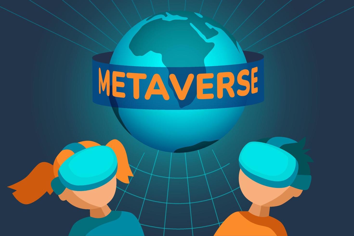 Children with VR glasses, boy and girl in virtual reality headset look on meta universe globe, metaverse script, cyber network web block chain concept. Vector illustration. Pro Vector